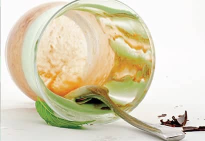 3. Répartir la meringue dans deux bols. Dans le premier, ajouter le sorbet et mélanger rapidement. Dans le second, ajouter l'essence de menthe et mélanger.