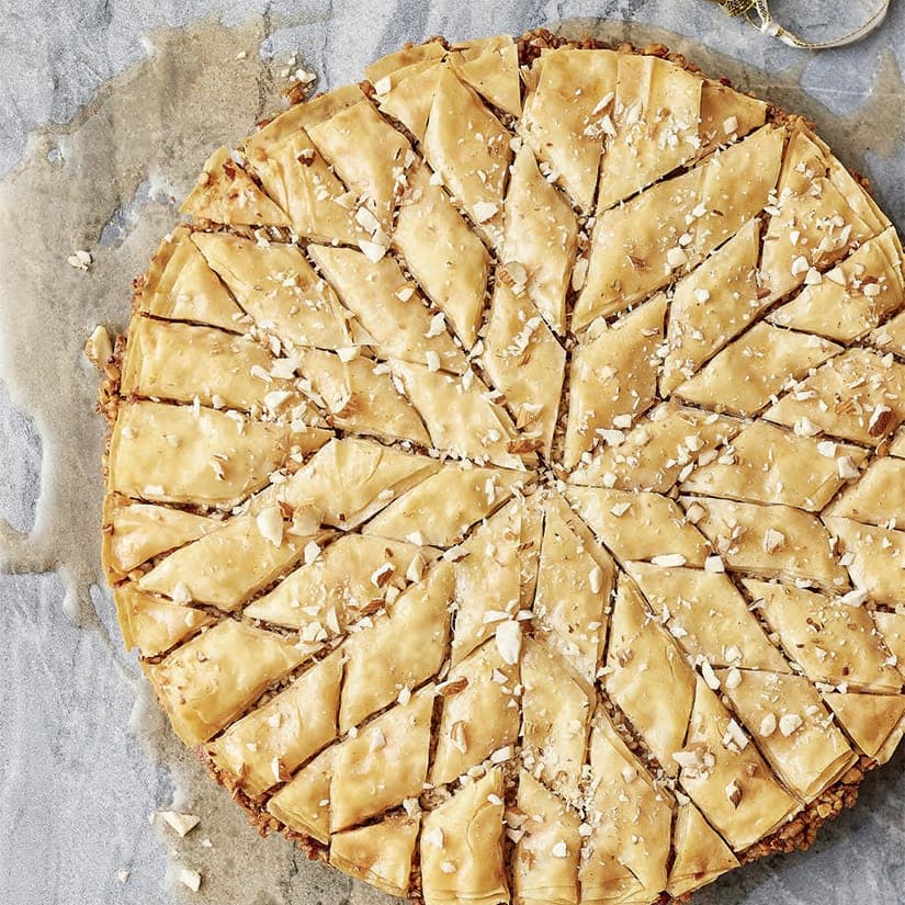 - Préchauffer le four à 350 °F (180 °C). Détacher délicatement un des cercles de pâte de la pile (laisser le reste sous le linge). Badigeonner le cercle d'un peu du beurre fondu et le déposer dans le moule. Répéter l'opération avec 6 autres cercles de pâte phyllo, de manière à obtenir une épaisseur de 7 feuilles en tout. Dans le moule, étendre la moitié de la garniture aux noix réservée et lisser le dessus à l'aide d'une spatule. Couvrir de 3 autres cercles de pâte phyllo badigeonnés d'un peu du beurre fondu. Étendre le reste de la garniture aux noix et lisser le dessus. Couvrir des cercles de pâte phyllo restants, en prenant soin de les badigeonner d'un peu du beurre fondu.