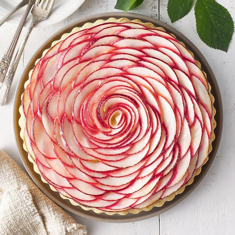 - Étendre délicatement la compote de pomme sur la crème de pacanes refroidie. Disposer les tranches de pommes en cercles concentriques sur la compote, en commençant par l'extérieur et en les faisant se chevaucher (égoutter les tranches de pomme au fur et à mesure pour enlever l'excédent de sirop et les éponger légèrement avec du papier essuie-tout). Pour créer le cœur de la fleur: sur le plan de travail, aligner 8 tranches de pommes les unes à côté des autres, en les superposant légèrement pour former un ruban. Enrouler le ruban de pommes sur lui-même, puis le déposer au centre de la tarte.
