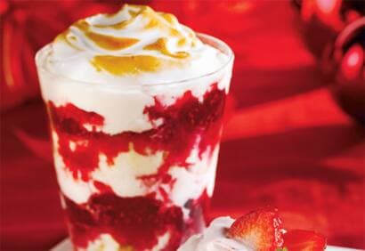 - Entre-temps, à l'aide d'un long couteau dentelé, couper le gâteau en tranches de 1/2 po (1 cm) d'épaisseur. À l'aide d'un emporte-pièce rond, couper 12 cercles du même diamètre que les verrines. Déposer un cercle de gâteau au fond d'une verrine résistant à la chaleur (de type Pyrex) d'une capacité de 1 1/2 t (375 ml). Couvrir de 2 c. à tab (30 ml) du sirop de fruits, puis d'environ 3 c. à tab (45 ml) de la crème glacée. Répéter l'opération en terminant par la crème glacée. Remplir les 5 autres verrines de la même manière. Mettre les verrines au congélateur pendant environ 30 minutes ou jusqu'à ce que la crème glacée ait durci.