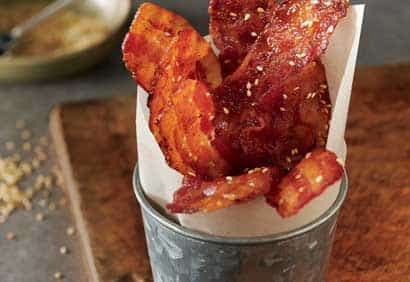 - Cuire au four préchauffé à 375°F (190°C) pendant 10 minutes. Retirer l'excédent de gras des plaques et parsemer le bacon des graines de sésame, si désiré. Intervertir les plaques et poursuivre la cuisson de 5 à 10 minutes, selon l'épaisseur du bacon, ou jusqu'à ce qu'il grésille et soit doré. Égoutter le bacon sur des essuie-tout, le côté glacé dessus, puis laisser refroidir légèrement.