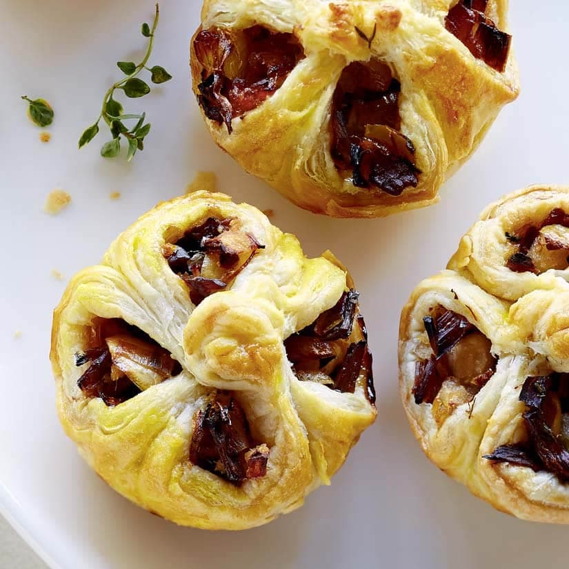 - Sur une surface légèrement farinée, abaisser la pâte en un rectangle de 16 po x 12 po (40 x 30 cm). Couper l'abaisse en 16 rectangles de 4 po x 3 po (10 cm x 8 cm). Presser chaque morceau de pâte dans des moules à muffins beurrés. Répartir la garniture réservée (environ 2 c. à tab/ 30 ml) au centre de chaque carré de pâte en pressant. Ramener les pointes vers le centre, par-dessus la garniture et les presser ensemble pour sceller les feuilletés.