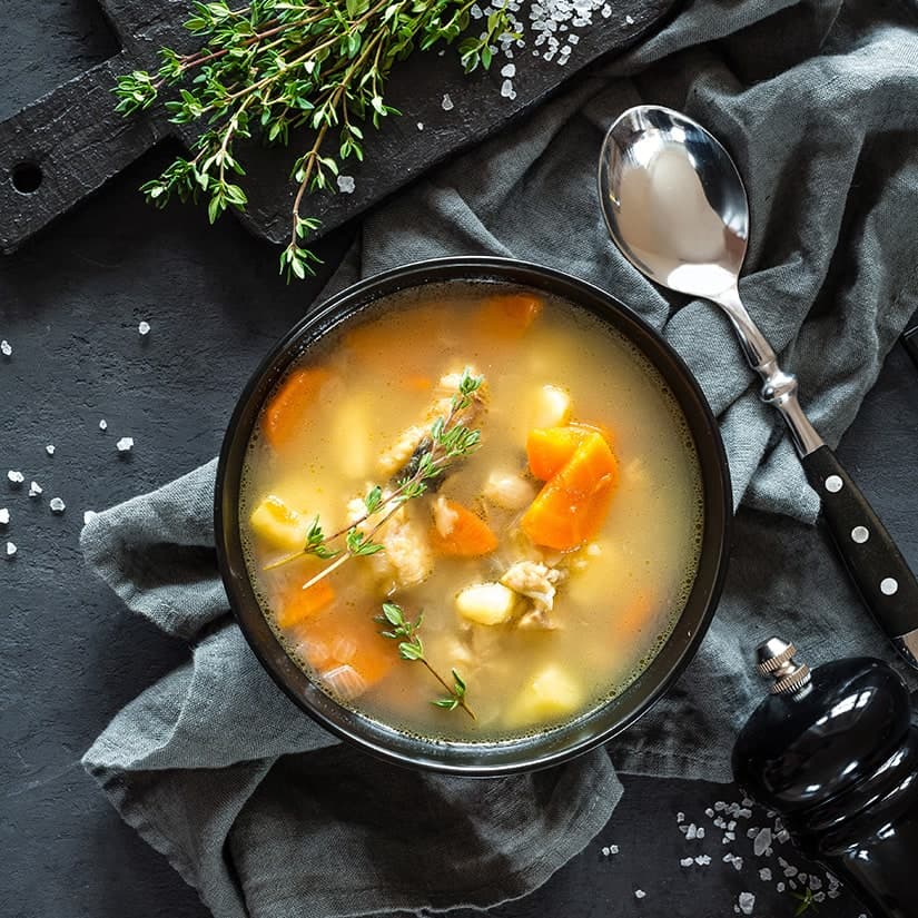 - Dans une casserole, chauffer l'huile à feu moyen. Ajouter l'oignon, la carotte, le céleri et le thym et cuire pendant environ 5 minutes ou jusqu'à ce que les légumes aient ramolli.