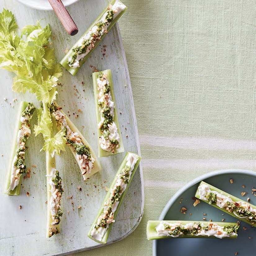 Céleri farci de fromage à la crème et garni de pesto de feuilles de céleri