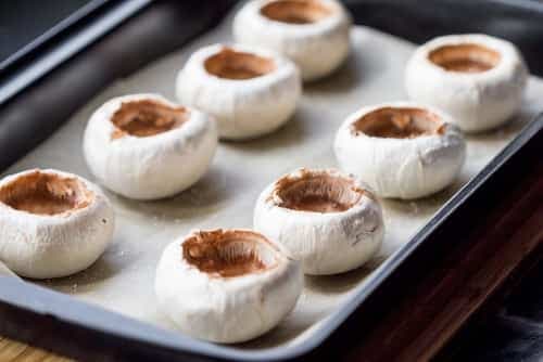 1. Mettre les chapeaux des champignons, le côté creux dessous, sur une plaque de cuisson tapissée de papier d'aluminium et les badigeonner de l'huile. Cuire au four préchauffé à 400°F (200°C) pendant environ 8 minutes ou jusqu'à ce qu'ils aient légèrement ramolli. Laisser refroidir et égoutter. Déposer les chapeaux, le côté creux dessus, sur une plaque de cuisson propre tapissée de papier d'aluminium.