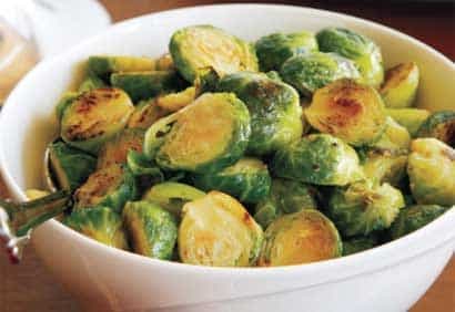- Dans une grande casserole d'eau bouillante salée, blanchir les choux de Bruxelles, en plusieurs fois, pendant 3 minutes. À l'aide d'une écumoire, retirer les choux de Bruxelles et les mettre dans un bol rempli d'eau glacée. Mettre les choux de Bruxelles sur une plaque de cuisson tapissée d'essuie-tout et les éponger. (Vous pouvez préparer les choux de Bruxelles jusqu'à cette étape et les mettre dans un contenant hermétique. Ils se conserveront jusqu'au lendemain au réfrigérateur.)