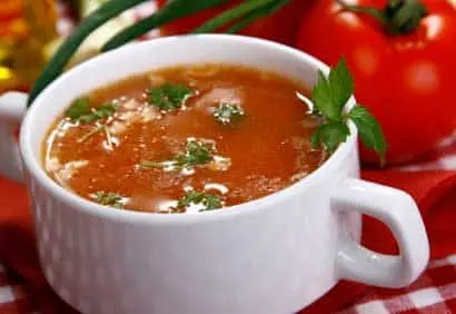 Consommé de tomates, croûtons au parmesan et huile de ciboulette