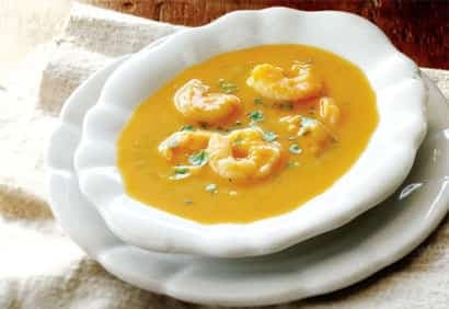 - À l'aide d'un mélangeur à main ou au robot culinaire, réduire la préparation de patates douces en purée lisse. Ajouter les crevettes et mélanger. Couvrir et poursuivre la cuisson à intensité élevée pendant environ 15 minutes ou jusqu'à ce que les crevettes soient rosées.