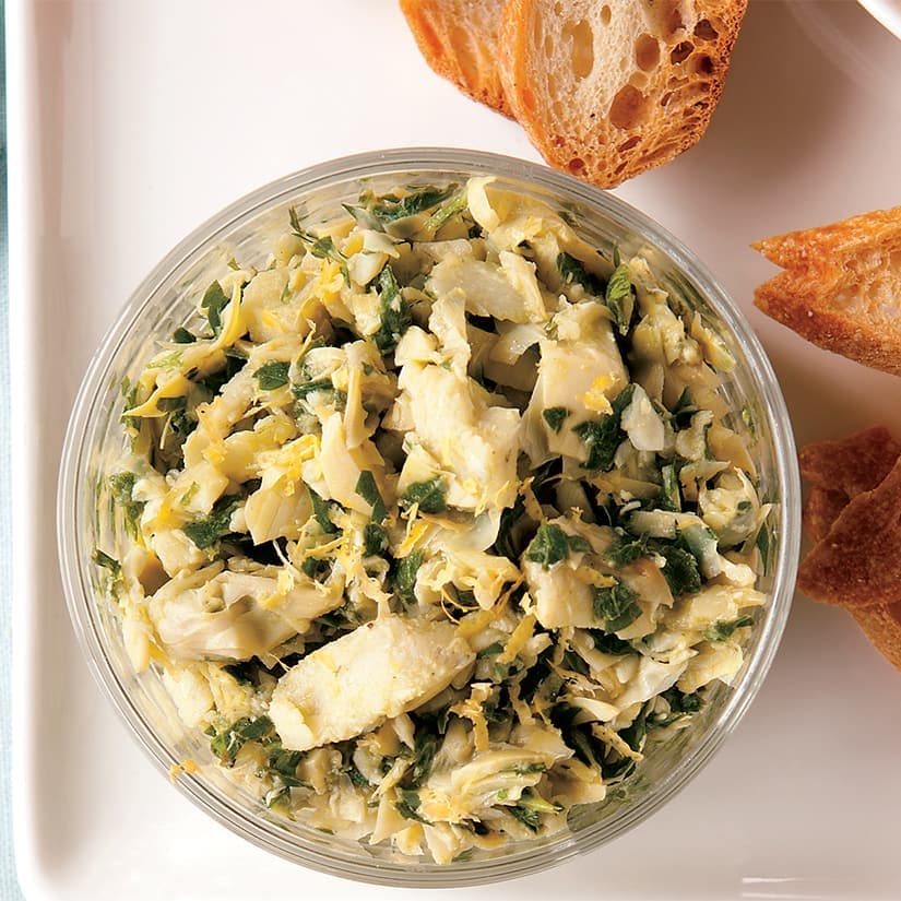 - Au robot culinaire, mélanger le persil, l'huile, l'ail, le sel et les flocons de piment fort jusqu'à ce que le persil soit haché finement. Ajouter les coeurs d'artichauts et le jus de citron et mélanger, en actionnant et en arrêtant successivement l'appareil, jusqu'à ce que les coeurs d'artichauts soient hachés finement, sans plus (ne pas les mettre en purée).