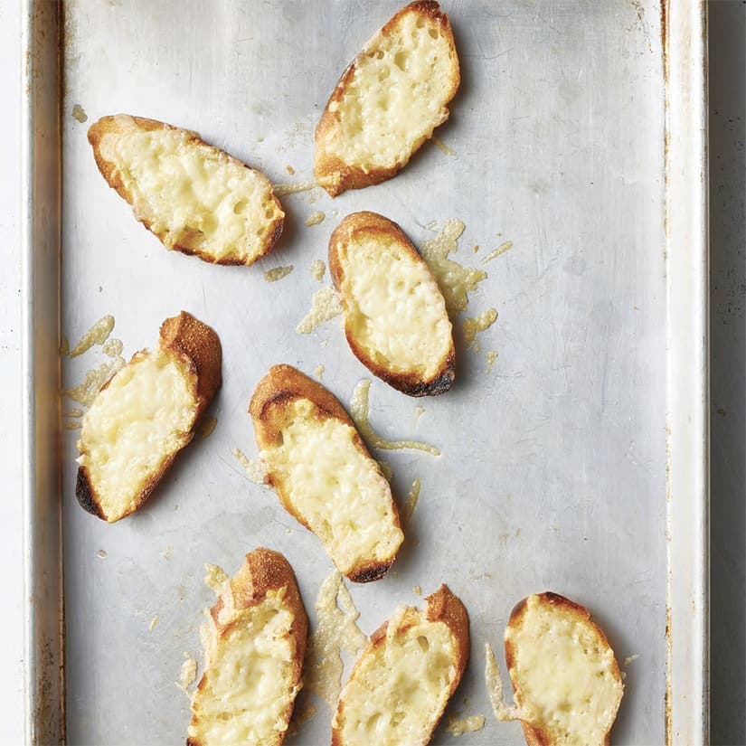 On peut préparer ces croûtons avec différentes variétés de pain: pain tranché, demi-pains à hamburger, morceaux de baguette, demi-tranches de miche campagnarde, etc. C’est également une belle façon d’utiliser les restes de fromage qui traînent dans le frigo.