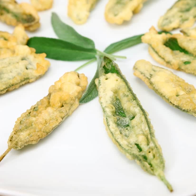 - Dans une casserole ou dans un petit poêlon profond, chauffer l'huile à feu moyen jusqu'à ce qu'un thermomètre à friture indique 325°F (160°C). En tenant les feuilles de sauge par la tige, les passer dans la pâte aux anchois en les retournant pour bien les enrober. Mettre les feuilles de sauge, quelques-unes à la fois, dans l'huile chaude et cuire pendant environ 2 minutes ou jusqu'à ce qu'elles soient dorées (retourner une fois en cours de cuisson). Égoutter les feuilles de sauge sur des essuie-tout. Servir chaud ou à la température ambiante.
