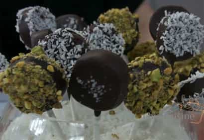 - Planter un bâtonnet dans chaque tranche de foie gras. Tremper rapidement chaque rondelle de mousse de foie gras dans le chocolat fondu. Laisser égoutter un peu et rouler les 6 premiers « bonbons » de foie gras au chocolat dans les pistaches hachées. Placer sur une assiette recouverte de papier sulfurisé.