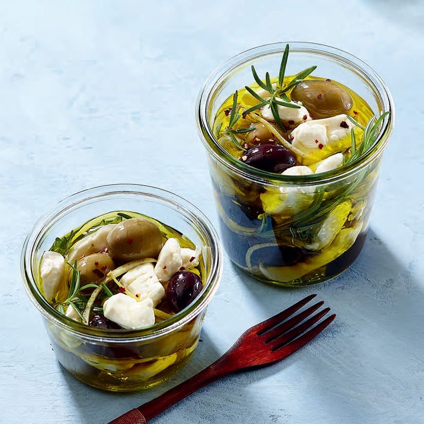 Fromage en grains et olives marinés au romarin