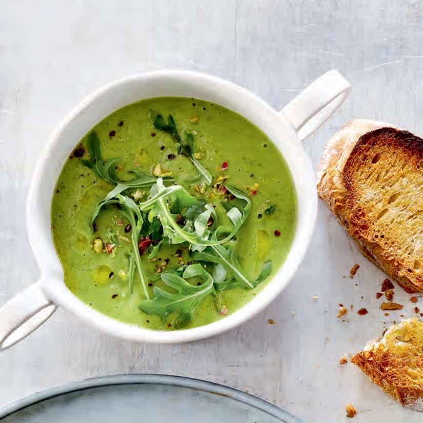 - Au moment de servir, répartir le gaspacho d'avocat dans 4 bols de service. Garnir de pistaches, de roquette et d'un filet d'huile d'olive, si désiré.