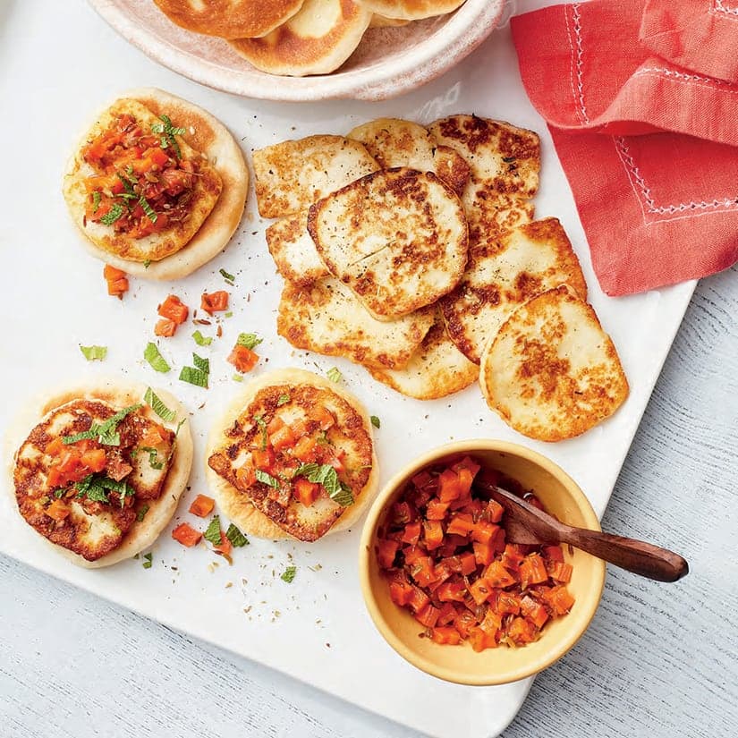 2. Chauffer un grand poêlon à feu moyen. Ajouter le fromage halloumi et cuire 4 minutes ou jusqu’à ce qu’il soit doré de chaque côté (le retourner à mi-cuisson). Garnir les minipitas du fromage poêlé et du chutney de carotte réservé. Parsemer de zaatar et de menthe, si désiré.
