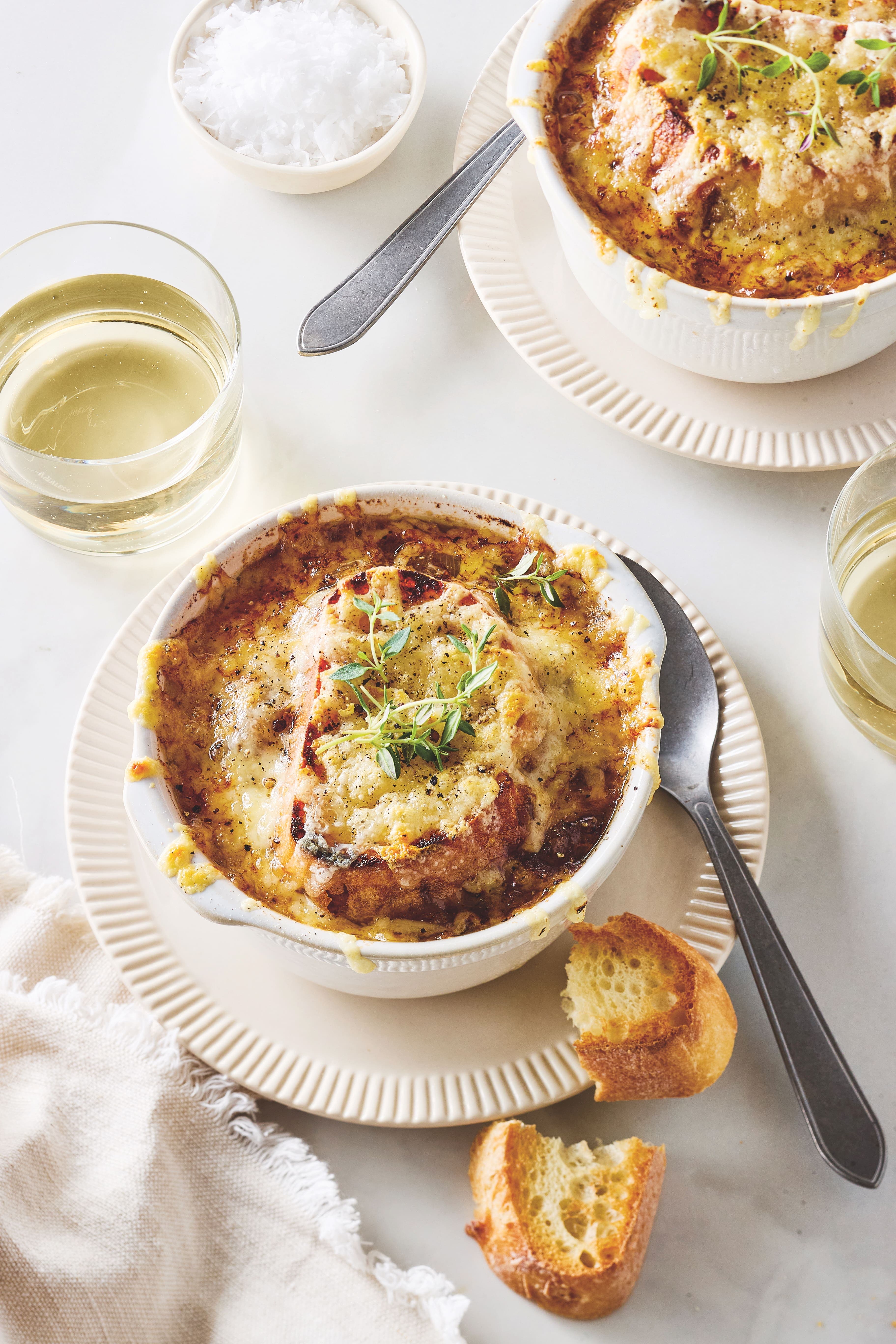 - Préchauffer le four à gril (broil). Répartir la soupe dans 4 bols à l'épreuve de la chaleur, déposés sur une plaque de cuisson. Mettre 1 ou 2 croûtons de baguette dans chaque bol, puis couvrir de fromage. Passer sous le gril de 3 à 5 minutes (ou jusqu'à ce que le fromage ait fondu et soit bien doré.) Garnir de thym frais, si désiré.