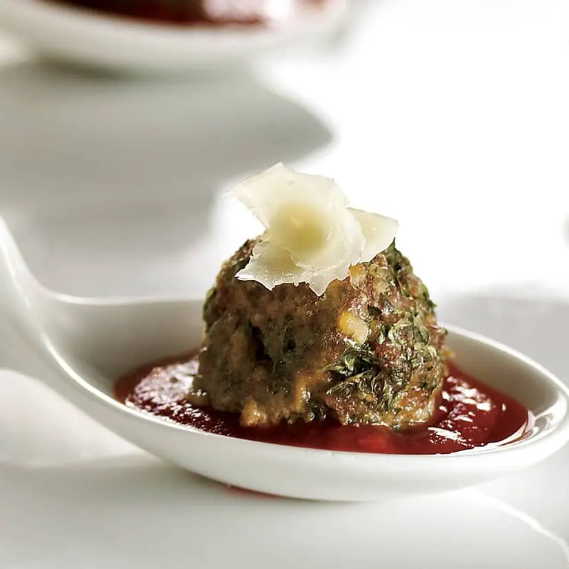 - Mettre 2 c. à thé (10 ml) de sauce tomate chaude et 1 mini-boulette dans chaque cuillère à cocktail (utiliser environ 1 t/250 ml de sauce tomate en tout). Garnir de copeaux de parmesan.