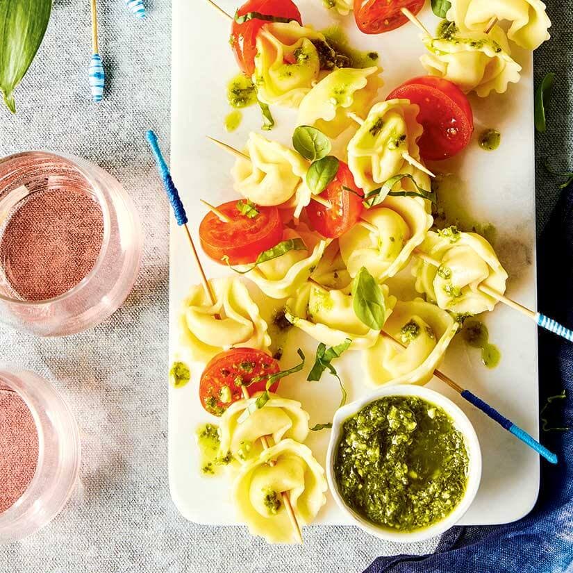 - Sur 20 petites brochettes en bois, enfiler 3 tortellinis et 1/2 tomate. Parsemer du basilic. Servir avec le pesto.