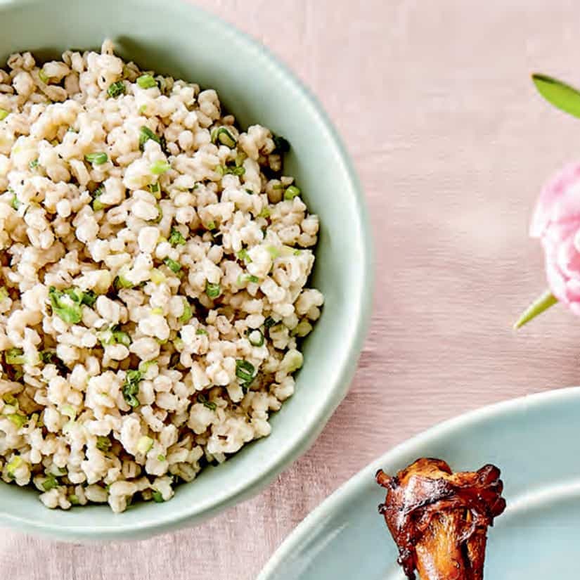 - Enlever la casserole du feu. Retirer l'ail, le laurier et le thym de la casserole (les jeter). Ajouter l'oignon vert à l'orge et mélanger. Saler et poivrer.