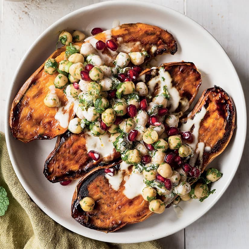 - Au moment de servir, répartir les patates douces dans les assiettes, le côté coupé vers le haut. Garnir de la salade de pois chiches et des arilles de grenade. Arroser de la crème de tahini.
