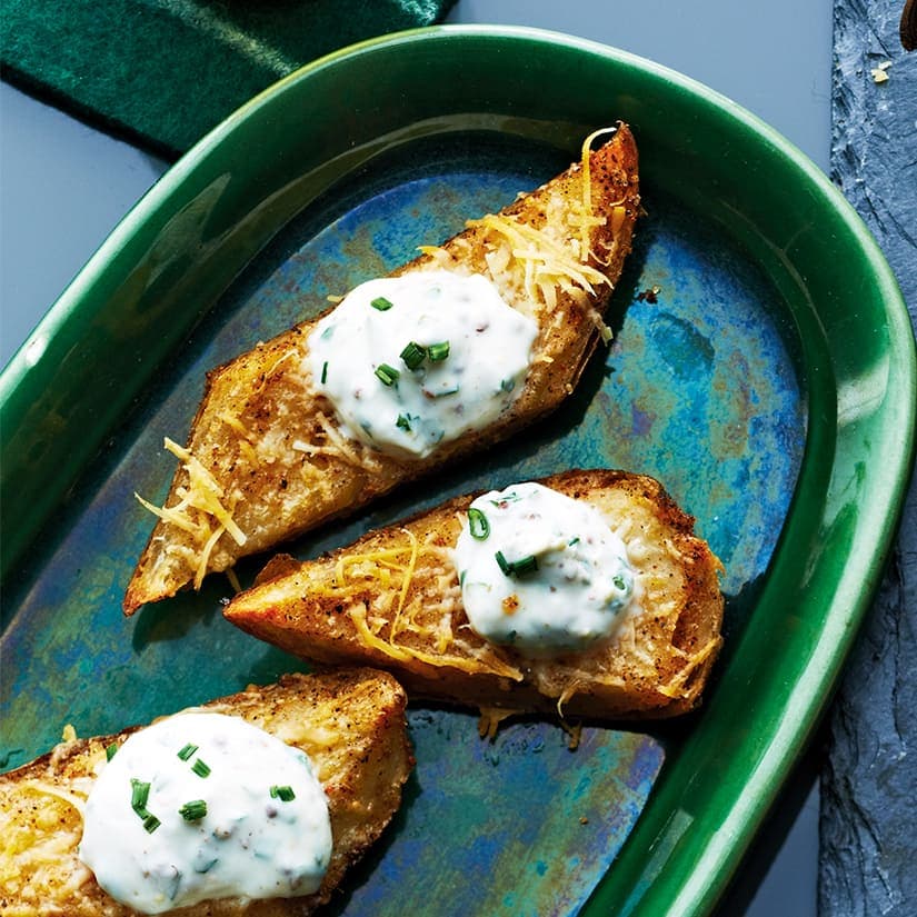 - À l'aide d'une fourchette, piquer les pommes de terre plusieurs fois. Cuire au four préchauffé à 350 °F (180 °C) pendant 1 heure 15 minutes ou jusqu'à ce qu'ellessoient tendres. Laisser refroidir légèrement. Couper les pommes de terre refroidies en gros quartiers sur la longueur. Retirer la chair des quartiers en laissant une épaisseur de 1/4 po (5 mm) (réserver la chair pour un usage ultérieur). Couper en 3 morceaux chaque pelure de pomme de terre dans le sens de la largeur sur le biais. (Les pelures de pommes de terre se conserveront jusqu'à 2 jours au réfrigérateur, couvertes de pellicule plastique.)