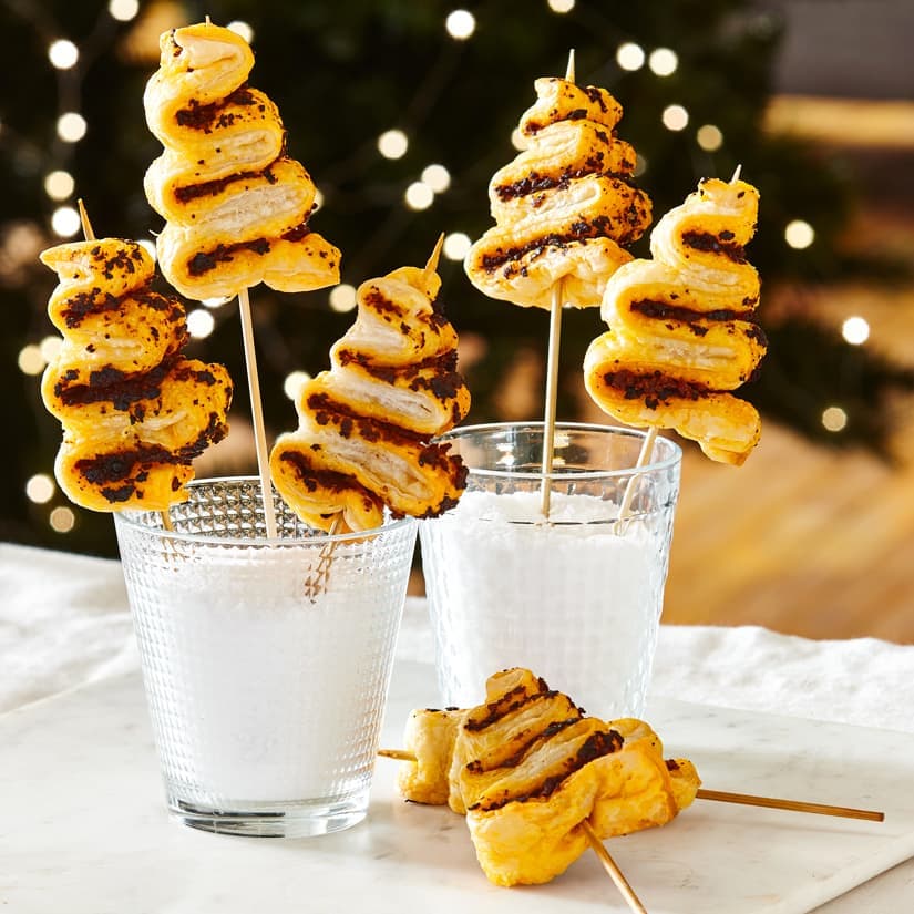 - Dérouler une des feuilles de pâte feuilletée et la badigeonner de la moitié du pesto aux tomates séchées. Couper la pâte en 9 bandes d'environ 1 po (2,5 cm) de largeur. Enfi ler chaque bande de pâte sur un pic en bois à la manière d'un accordéon de plus en plus étroit pour former un sapin. Réserver les sapins au réfrigérateur. Répéter les opérations avec l'autre feuille de pâte feuilletée et le reste du pesto.