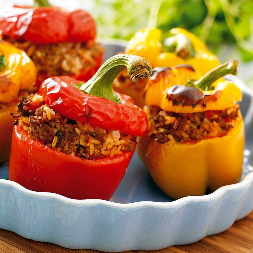 - Couper une tranche d'environ 1/2 po (1 cm) sur le dessus des poivrons, les évider et les farcir de la préparation de riz refroidie. Mettre les poivrons farcis dans la mijoteuse. Ajouter l'eau, le jus de citron et le reste de l'huile. Couvrir et cuire à faible intensité pendant 8 heures.