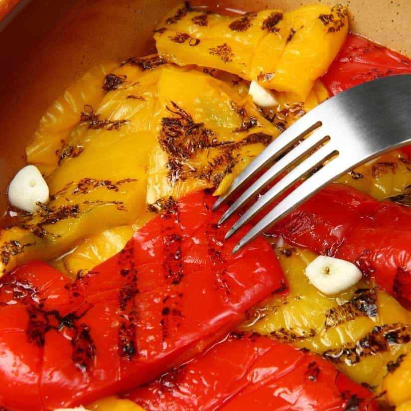 - Mélanger le vinaigre balsamique, le basilic, l'huile d'olive et y saupoudrer le sucre, le sel et le poivre. Verser sur les poivrons grillés.