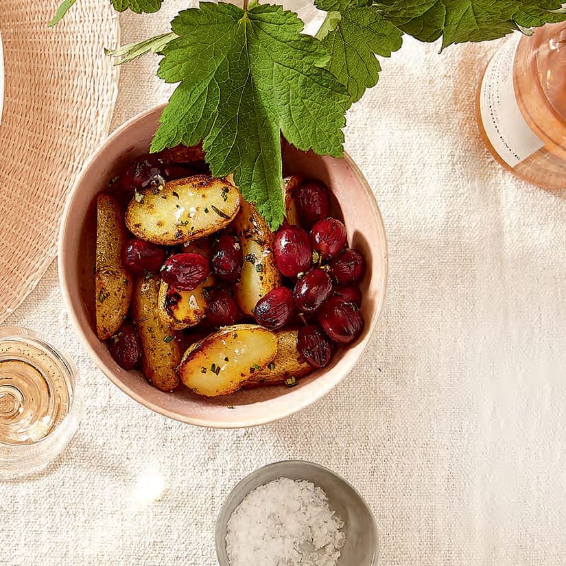 - Sur une plaque de cuisson tapissée de papier d'aluminium, déposer les pommes de terre et les raisins. Arroser de l'huile d'olive. Parsemer du romarin. Saler, poivrer et mélanger. Répartir les pommes de terre et les raisins en une seule couche sur la plaque.