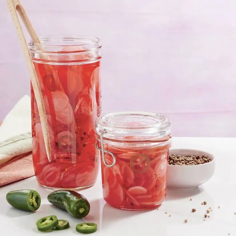 - Déposer les radis, l'oignon et le piment dans un bocal en verre d'une contenance de 4 t / 1 L (ou les répartir dans différents contenants plus petits). Réserver.