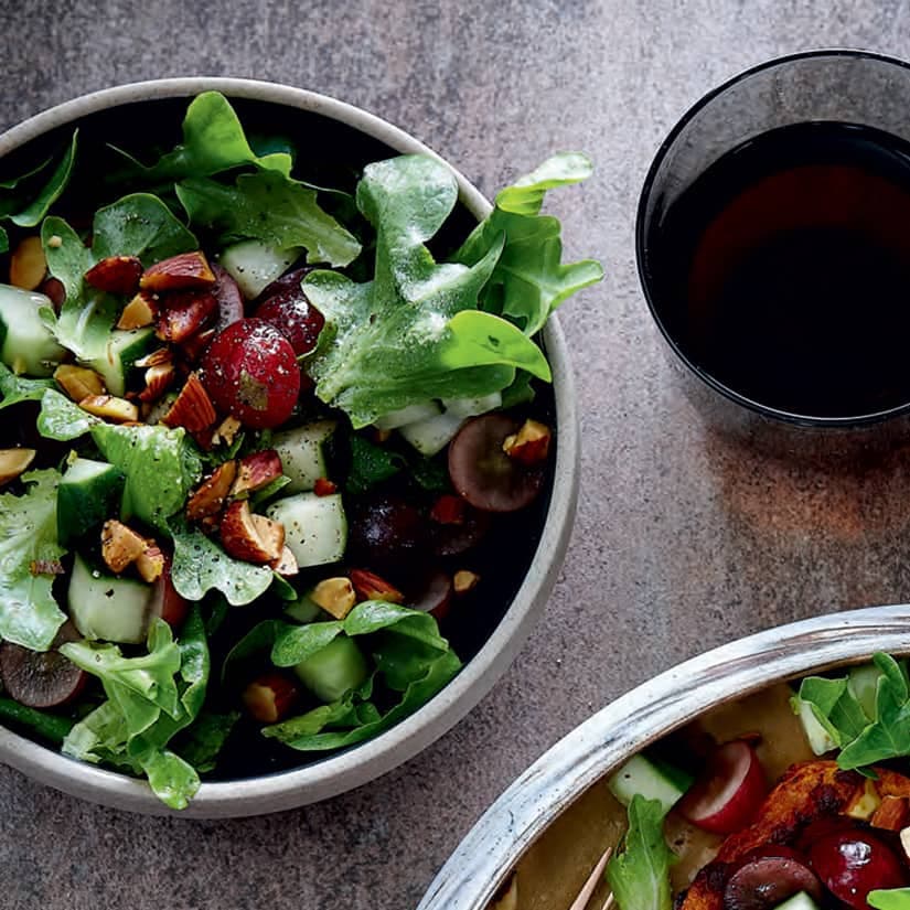 - Dans un grand bol, mélanger l'huile d'olive et le jus de citron. Saler et poivrer. Ajouter la laitue, les raisins, le concombre et les amandes au cari, puis mélanger pour bien les enrober.