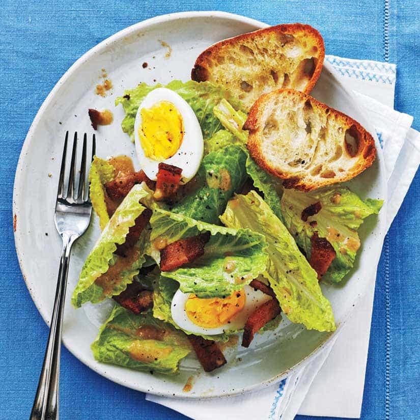 - Garnir du bacon, de croûtons de pain baguette et des œufs durs.