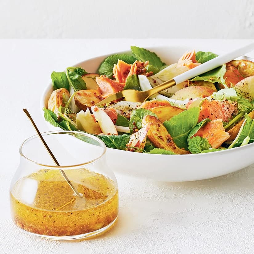 - Ajouter les pommes de terre et le chou frisé au fenouil réservé, puis remuer délicatement. Garnir de la truite fumée et de l'aneth. Arroser du reste de la vinaigrette.