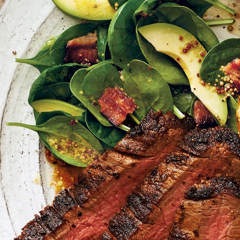 - Dans un saladier, mettre les épinards, le bacon et les avocats. Verser la vinaigrette et mélanger délicatement pour bien enrober les ingrédients.