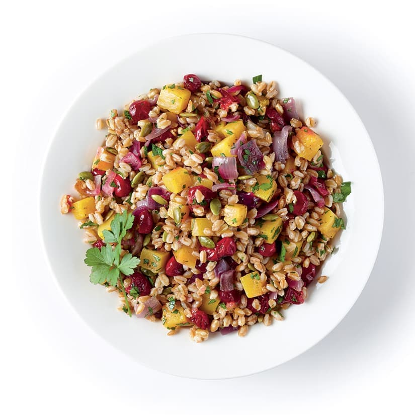 - Ajouter le mélange de courge et de canneberges rôties, le farro, les graines de citrouille et le persil, et mélanger.