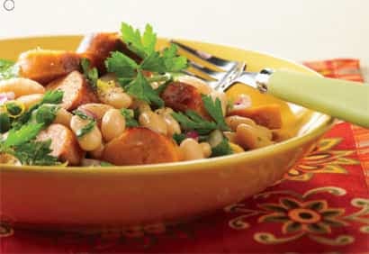- Dans un poêlon à surface antiadhésive, chauffer 1 c. à tab (15 ml) de l'huile à feu moyen. Ajouter les saucisses et cuire de 7 à 10 minutes ou jusqu'à ce qu'elles soient dorées et aient perdu leur teinte rosée à l'intérieur. Couper les saucisses en rondelles et les mettre dans un grand bol. Ajouter les haricots blancs, l'oignon rouge et la moitié du persil.