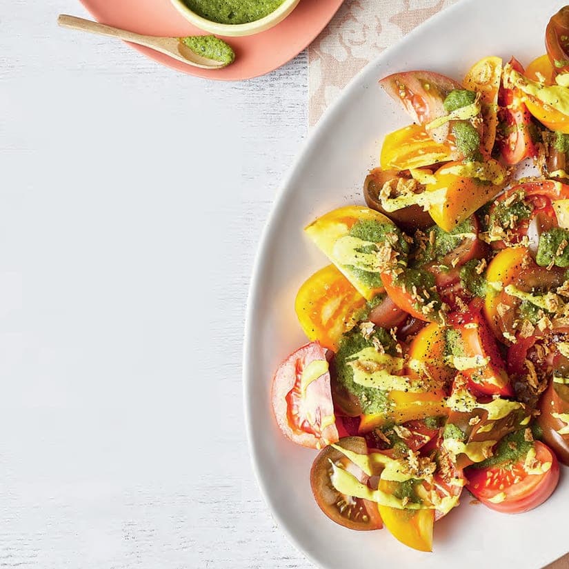 - Au moment de servir, disposer les tomates dans une assiette de service. Les arroser de la vinaigrette et de la moitié du coulis d'herbes réservé. Parsemer d'oignons frits. Servir avec le reste du coulis.