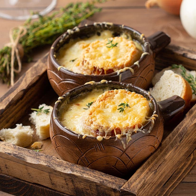 - À l'aide d'une louche, répartir la soupe dans quatre bols à soupe allant au four. Garnir chaque portion de 2 croûtons, puis parsemer du mélange de fromages. Déposer les bols à soupe sur une plaque de cuisson tapissée de papier-parchemin. Cuire au four préchauffé à 375°F (180°C) de 15 à 18 minutes ou jusqu'à ce que le fromage soit légèrement doré.