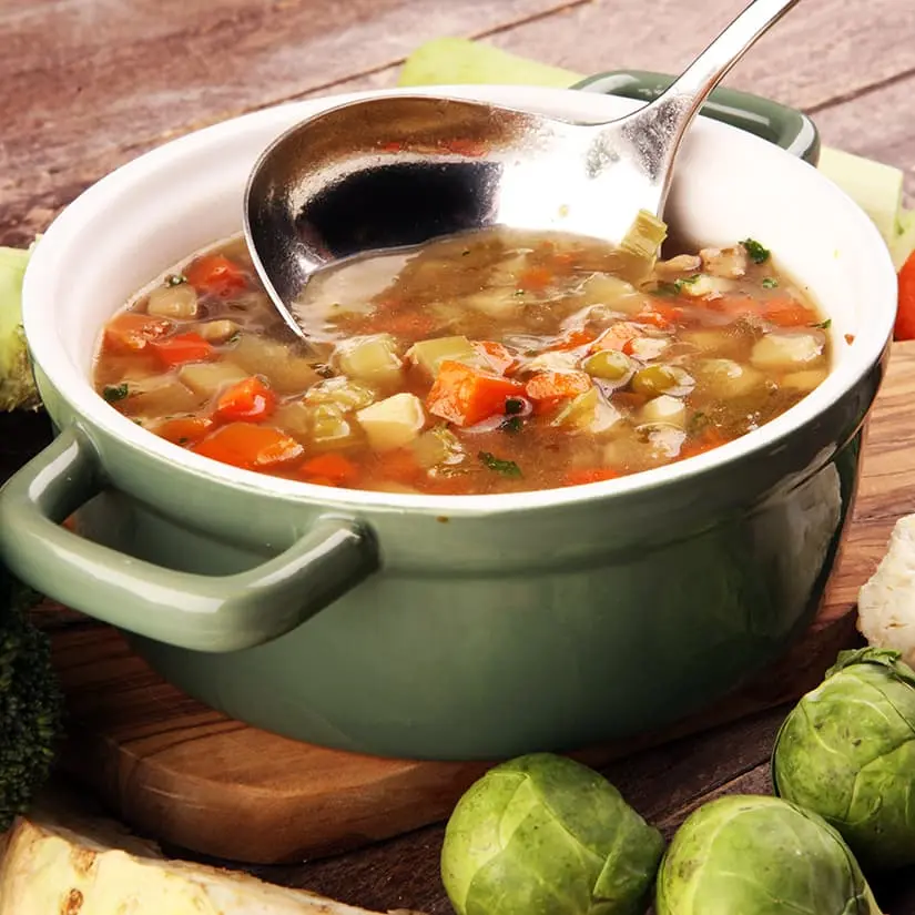 - Entre-temps, couper les légumes en petits morceaux. Les ajouter dans le bouillon avec l'orge, les tomates, les herbes salées et le jus de légumes, si désiré. Poivrer et faire bouillir 1 heure, en brassant de temps en temps.