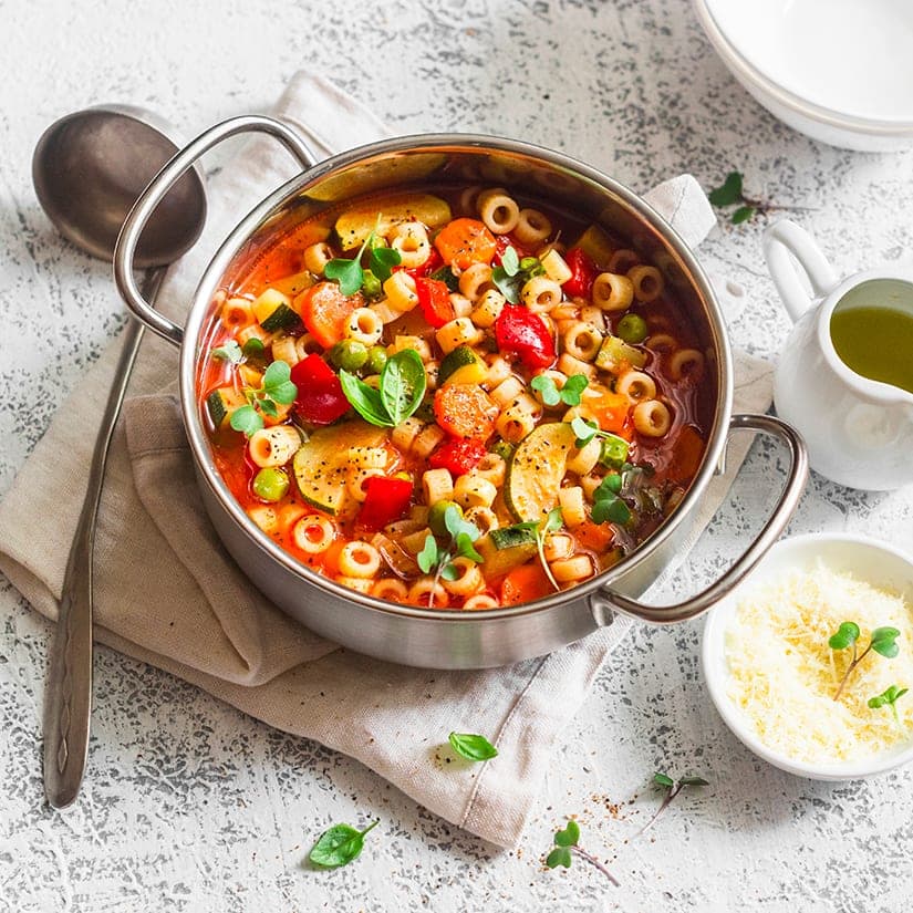- Ajouter les pâtes et mélanger. Réduire à feu moyen et laisser mijoter pendant 5 minutes. Ajouter les haricots de Lima et poursuivre la cuisson pendant 3 minutes ou jusqu'à ce que la soupe soit chaude. Au moment de servir, parsemer chaque portion des croûtons.