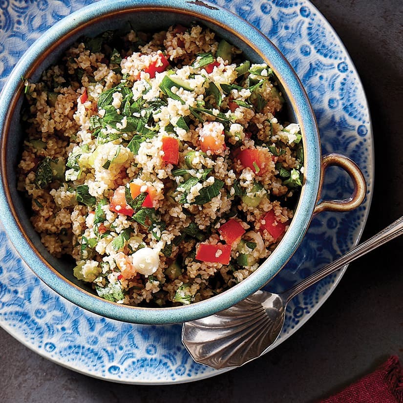 - Dans un grand bol, mélanger le bulghur, les tomates et les concombres, le persil, la menthe, les oignons verts, le jus de citron et l'huile d'olive. Saler et poivrer. Réfrigérer jusqu'au moment de servir. (La salade se conservera jusqu'au lendemain au réfrigérateur.)