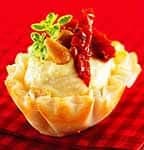 - Garnir chaque coquille d'environ 2 c. à thé (10 ml) de hummus, de deux lanières de tomates séchées, de deux pignons grillés et d'un brin d'origan.