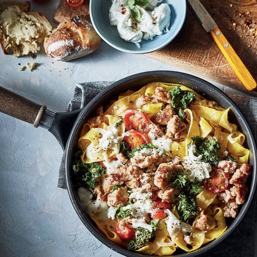 Ce week-end on se gâte! Au menu de ce repas 3 services: En entrée, parpadelles aux saucisses italiennes, au fenouil et au mozzarella, escalopes de veau saltimbocca en plat principal, et biscuits glacés au citron (tarallucci) comme dessert.