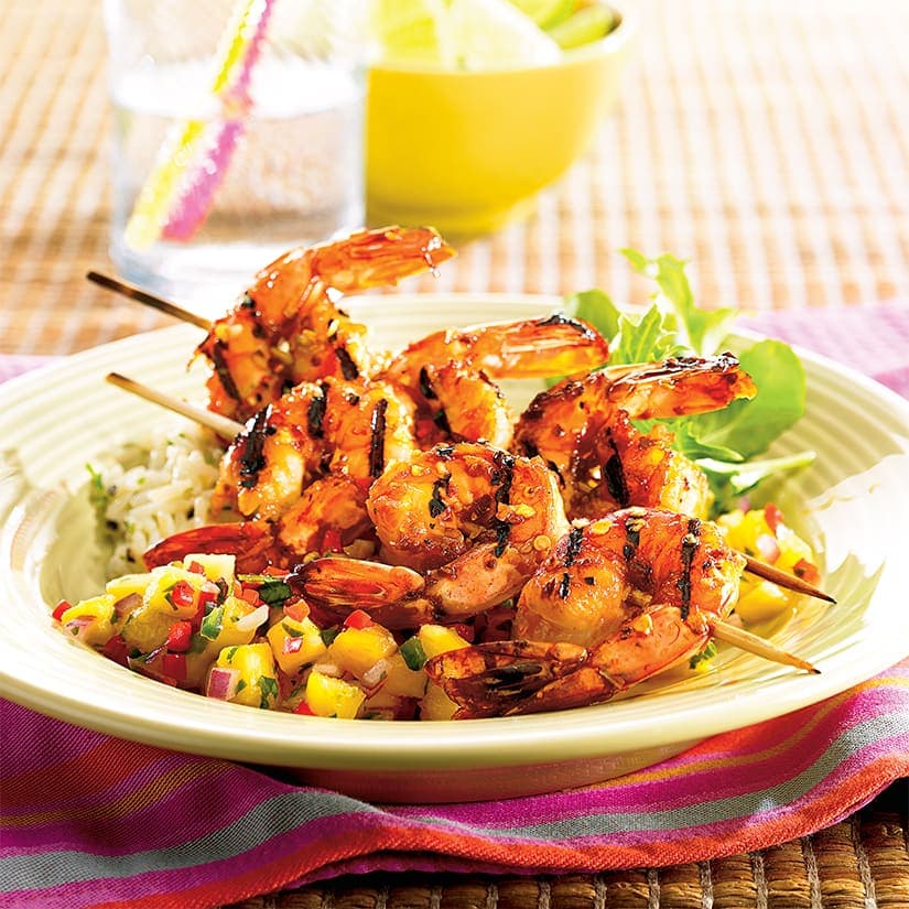 Un brin piquantes, marinées au rhum, à la lime et au gingembre, des crevettes grillées au goût des Caraïbes accompagnées d’une petite salsa à l’ananas délicieusement rafraîchissante. Miam!