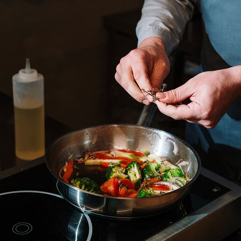 Spaghettis à la pancetta, aux tomates cerises et au basilic