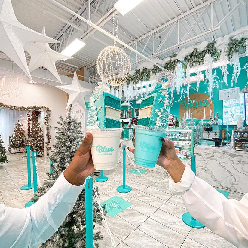 Premièrement, vous avez le choix de faire ajouter une pointe de gâteau des fêtes à la boisson de votre choix. Sinon, vous pouvez opter pour des créations uniques signées Le Blue comme le Chimney-Express, une pâtisserie de Noël à la cannelle remplie de morceaux de brownies gaufres et petits fruits, La Boule Magique, de la crème glacée à la vanille avec ses accompagnements et servie dans une boule de Noël, ou le Polar Drink, un lait frappé à la framboise bleu recouvert d’un cupcake à la vanille et décoré d’un bonhomme de neige, de crème fouettée et de confettis.