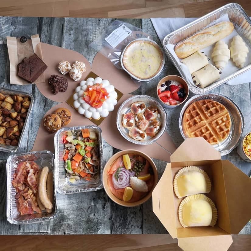 Le panier brunch est composé de 5 plats avec des produits frais d’ici: une frittata aux têtes de violon et fromage, un bavarois au fromage de chèvre, des cretons, desserts, boisson, et plus encore!