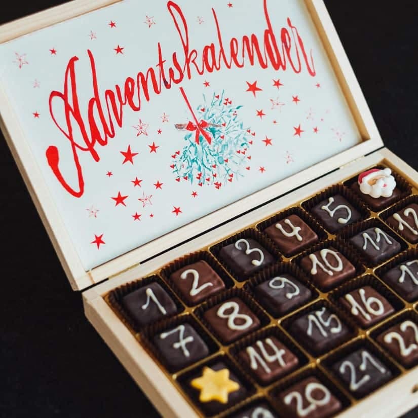 «Nos maîtres chocolatiers vous présentent ce calendrier de l’avent contenant 24 créations chocolatées totalement uniques et irrésistibles, confectionnées à la main. Découvrez un chocolat fin artisanal par jour! De grands classiques comme Caramel salé et Casse-Noisette, et des créations totalement éclatées telles qu’Amaretto Citron et Choco Crème. 100% recyclable. Fait de cacao durable.»