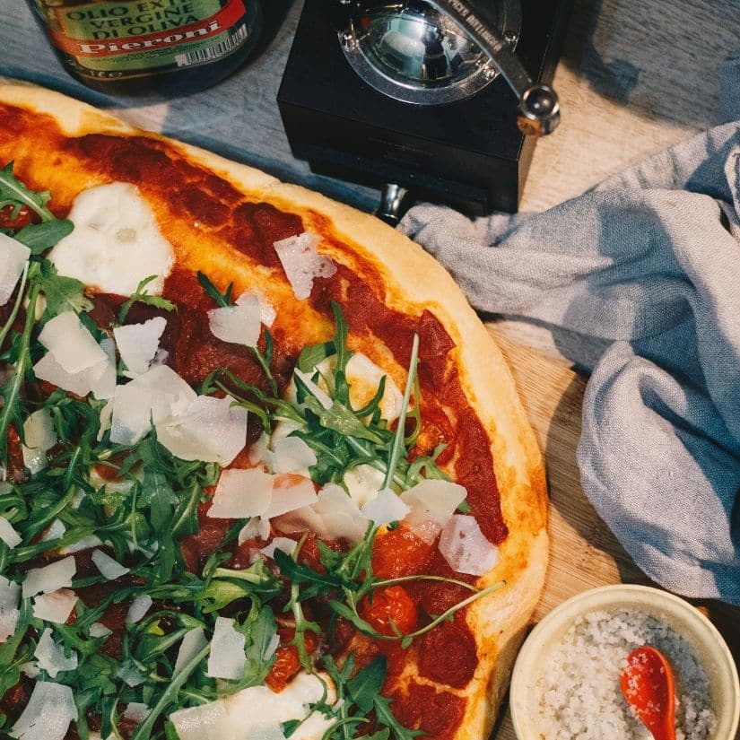 - Commencez par précuire votre pâte à pizza sur le grill ou au four, jusqu’à ce qu’elle soit dorée et croustillante. Déposez-la ensuite sur une planche à découper.