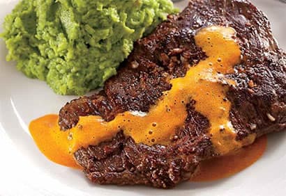 Bavette de boeuf marinée au poivre, purée de chou vert et jus de carotte